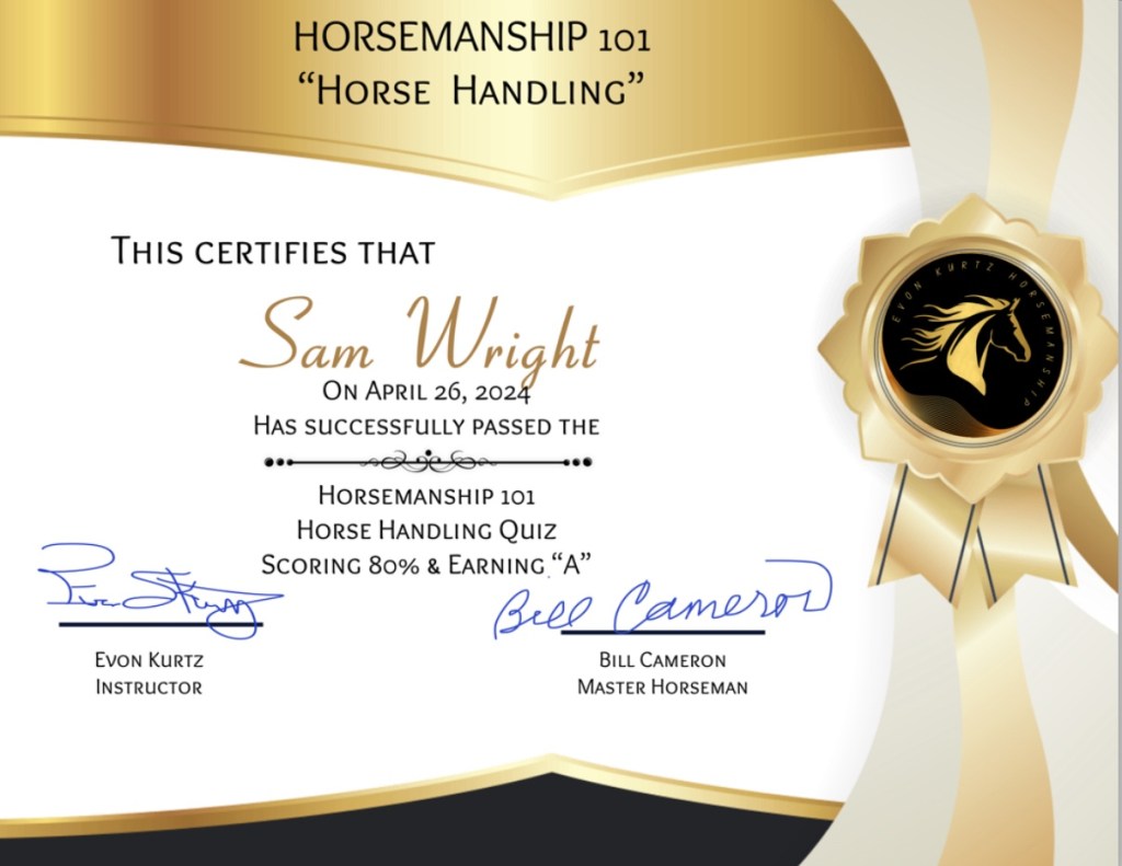 In person oral quizzes, in person riding tests and challenges (obstacle courses, Ranch Riding Patterns, Horsemanship Patterns). The Online Tests and final exam is created by Evon.